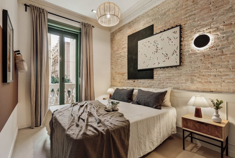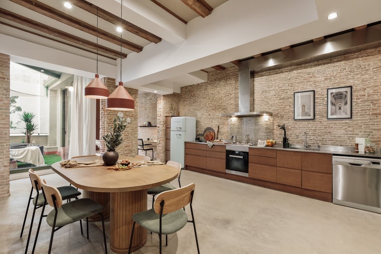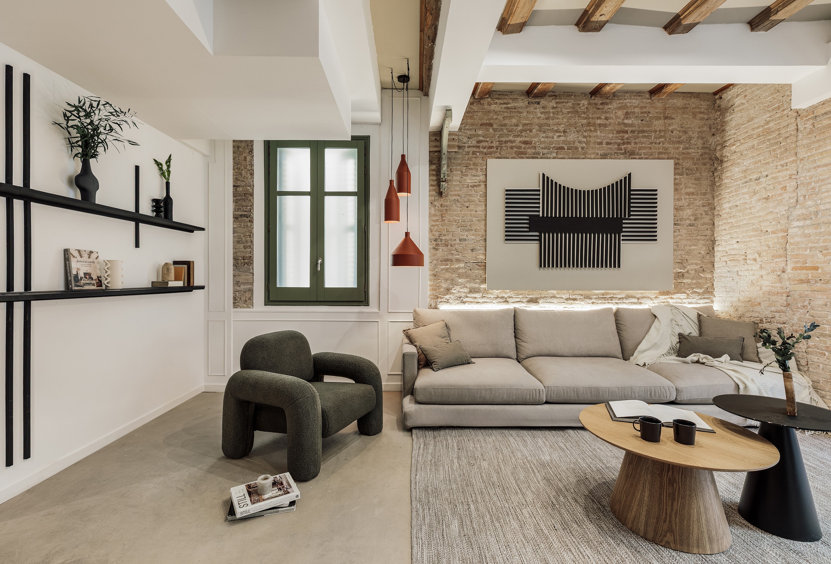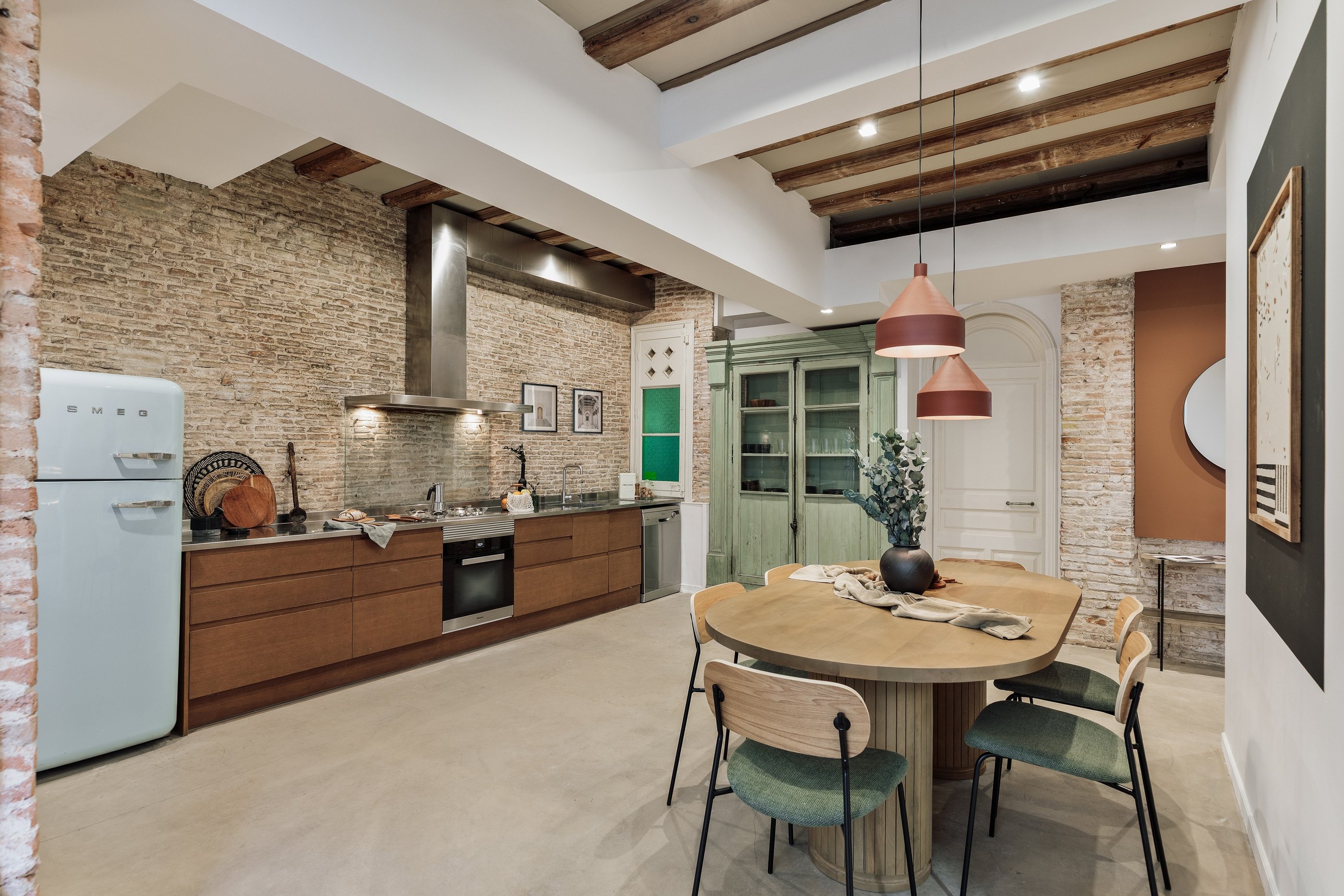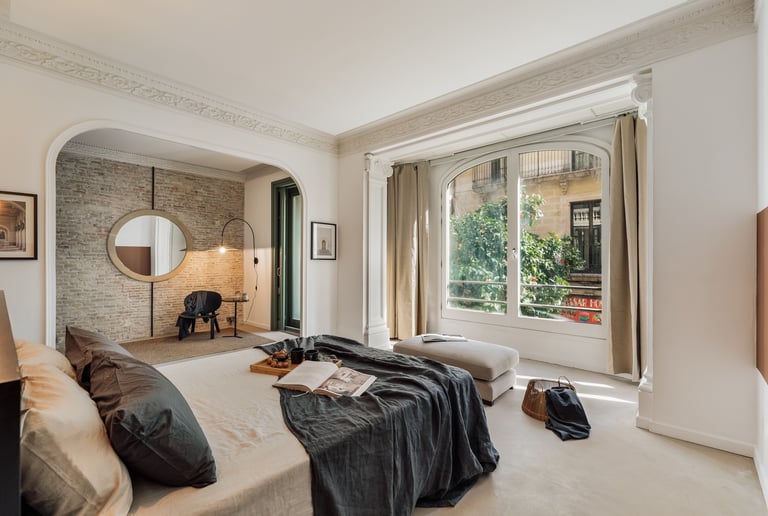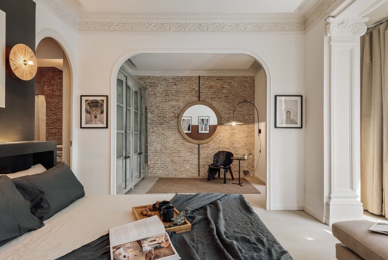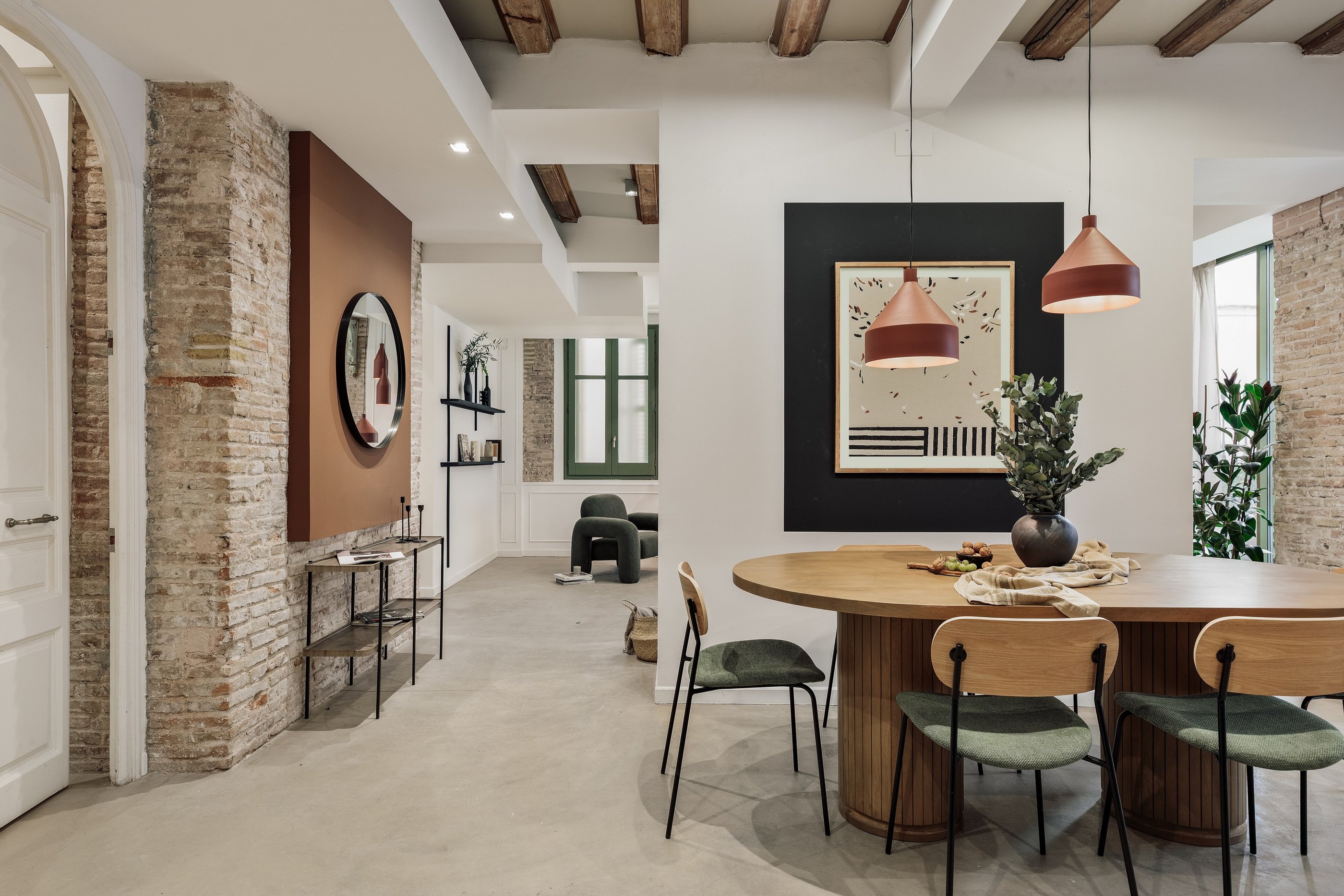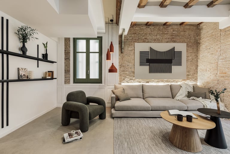 Galata is a 200 m² apartment in Barcelona's vibrant Gracia district that blends vintage charm, mid-century character, and contemporary design. The space itself was a true design canvas, with traditional Catalan vaulted ceilings, exposed brick walls, and vibrant green window frames. These original features provided rich textures and a strong architectural identity, guiding our design approach.