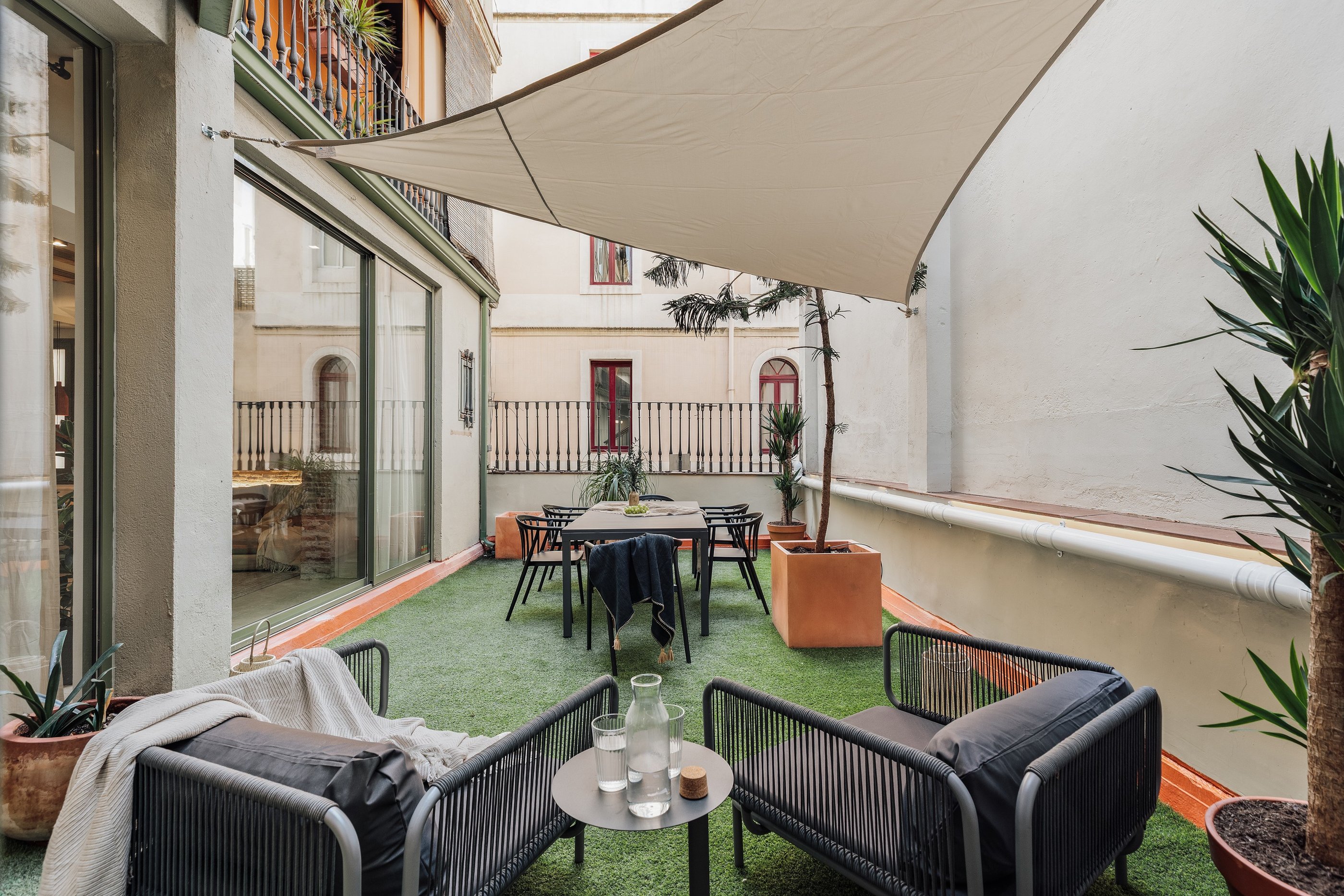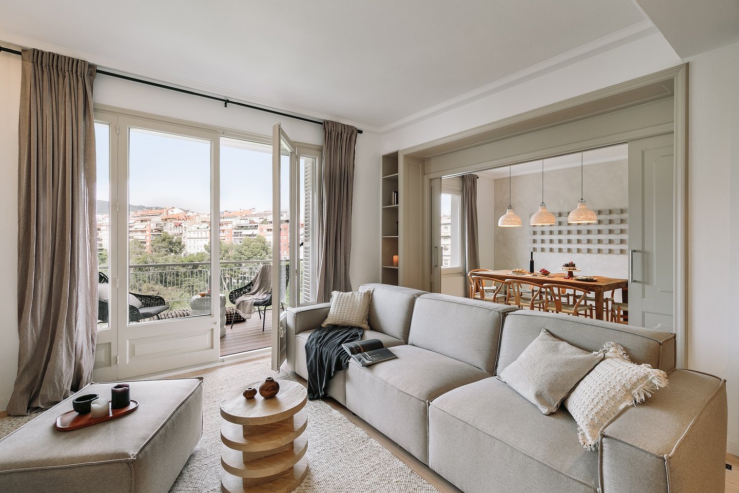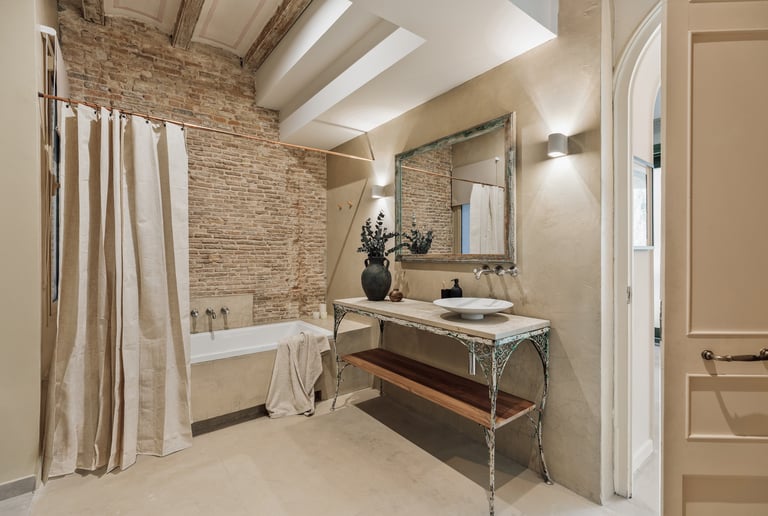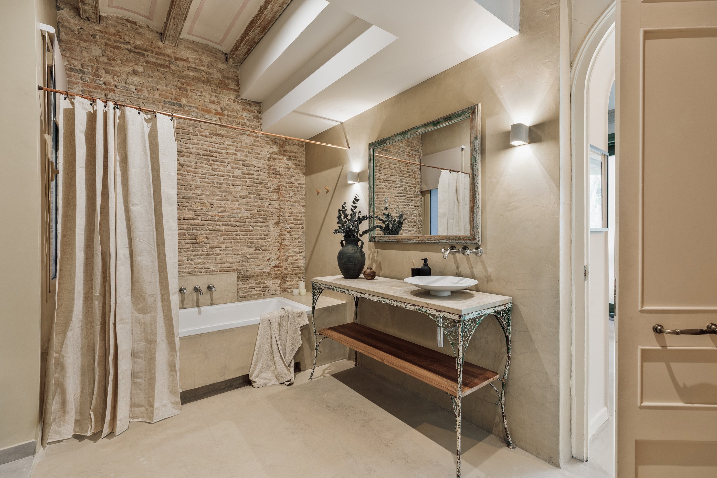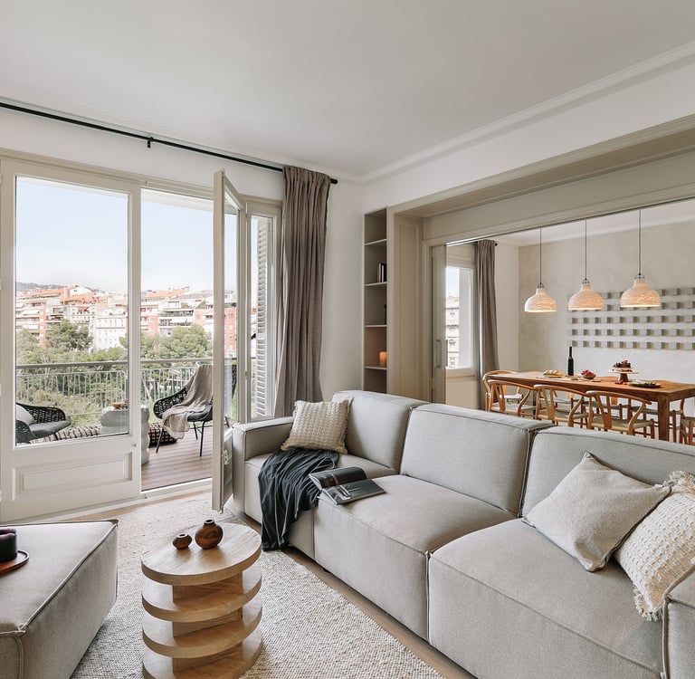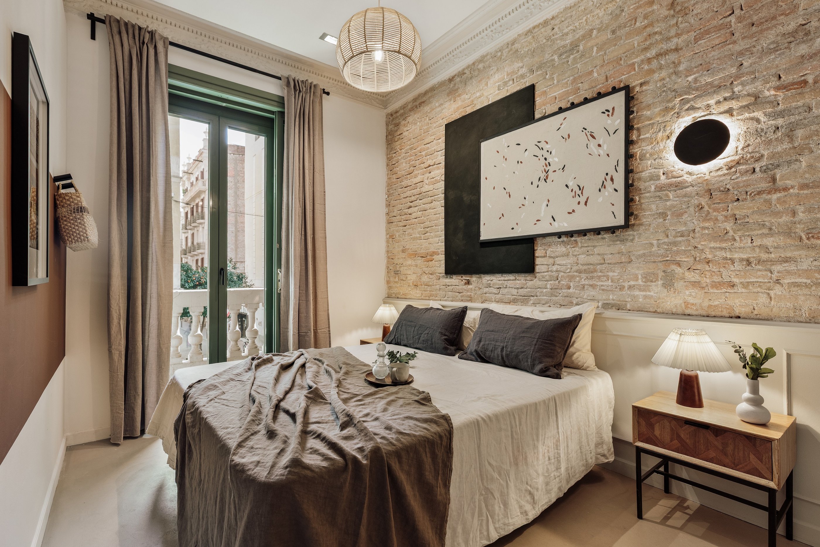 Galata is a 200 m² apartment in Barcelona's vibrant Gracia district that blends vintage charm, mid-century character, and contemporary design. The space itself was a true design canvas, with traditional Catalan vaulted ceilings, exposed brick walls, and vibrant green window frames. These original features provided rich textures and a strong architectural identity, guiding our design approach.