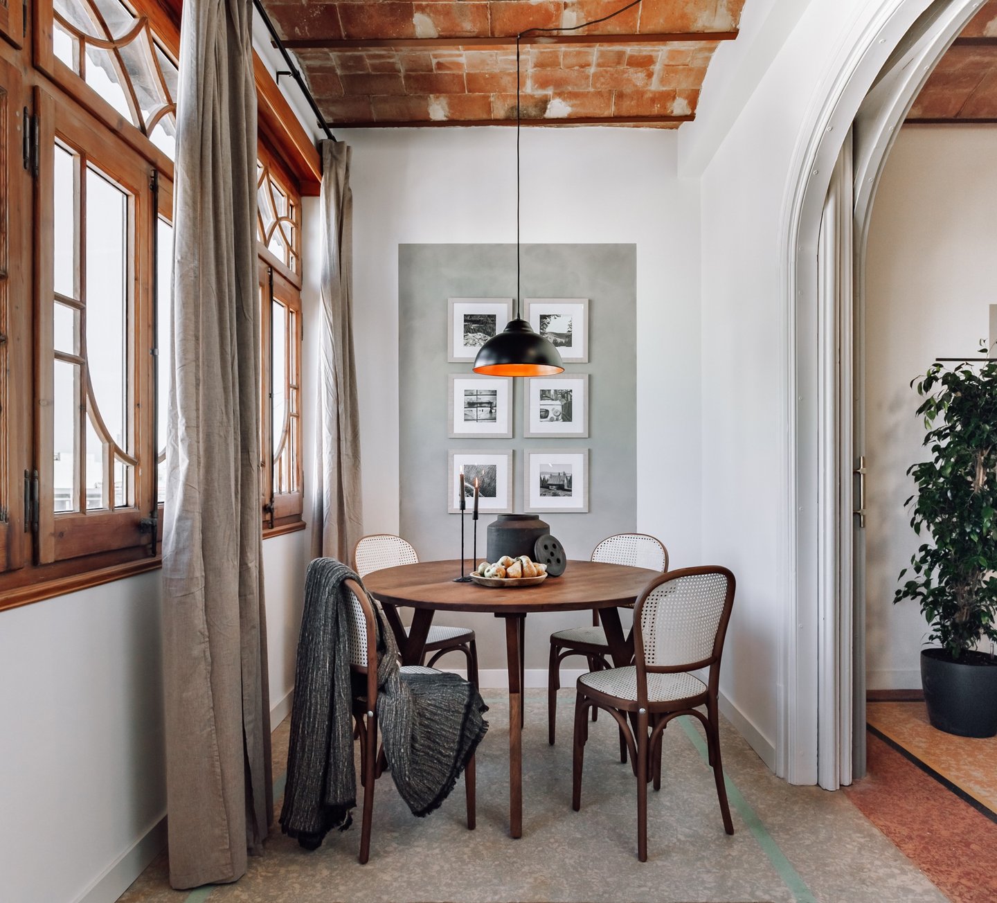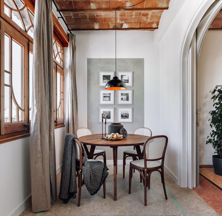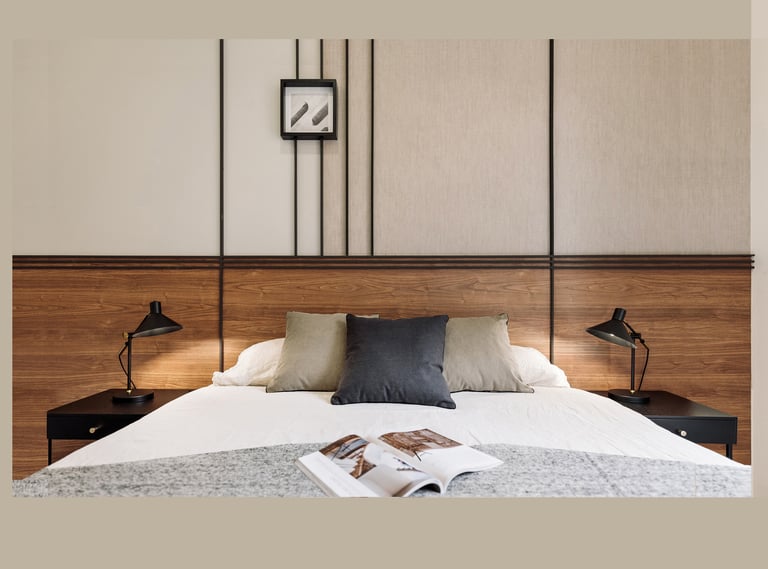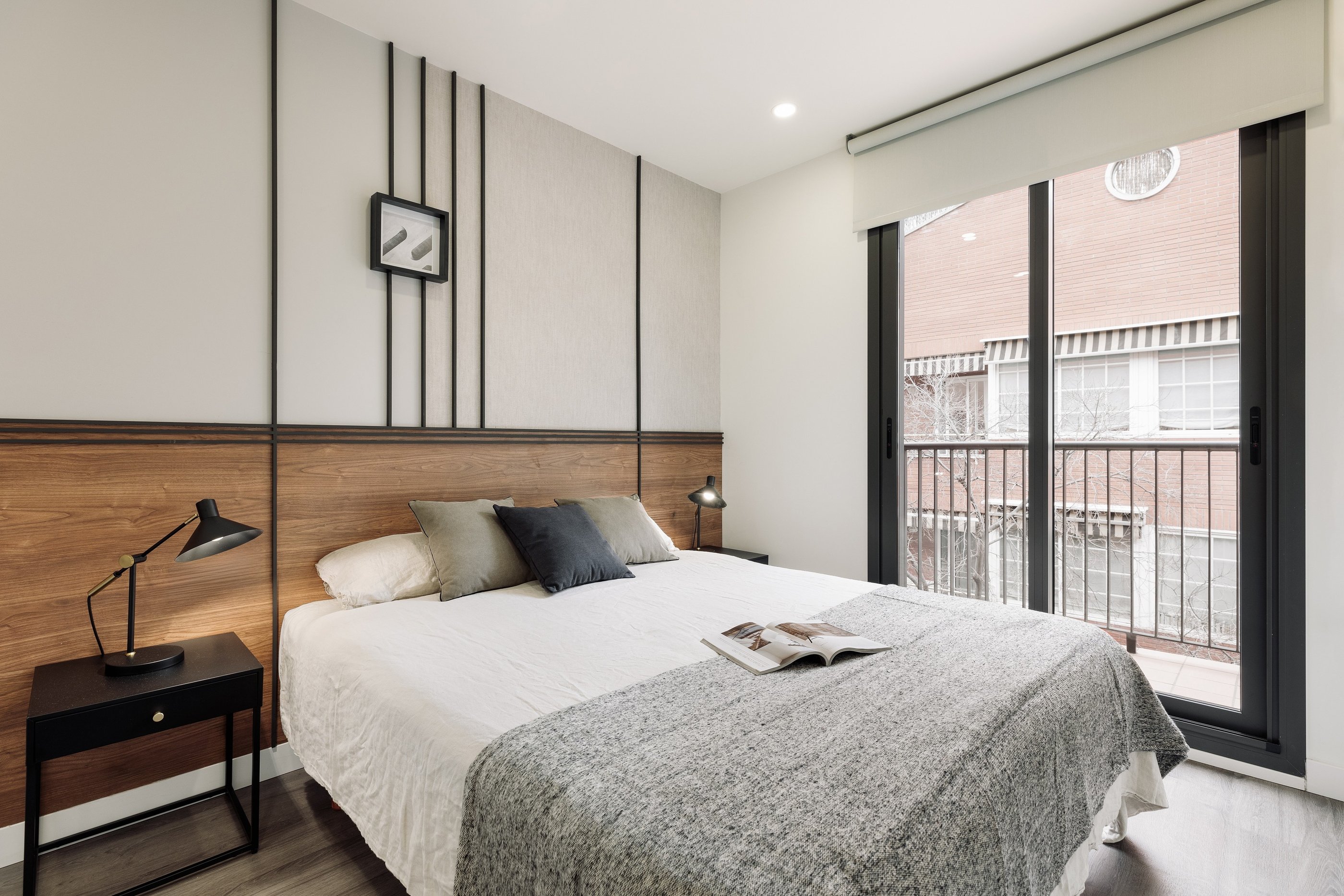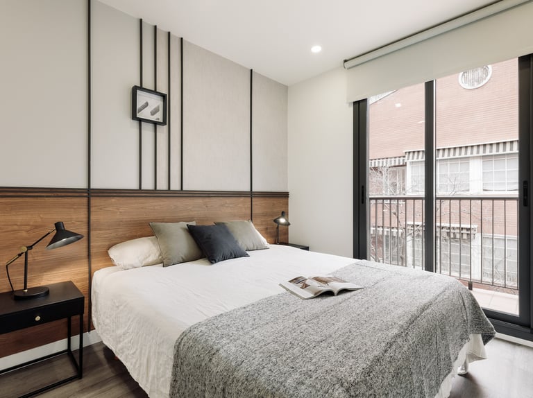 In the bedrooms, black-stained wooden headboards provide a playful contrast to the neutral tones, adding a touch of sophistication and modern edge to the design. We used subtle tones, black accent pieces, and tailored finishes to make this apartment both timeless and fresh, offering a welcoming and stylish retreat in the heart of Barcelona’s lively, sun-filled landscape.