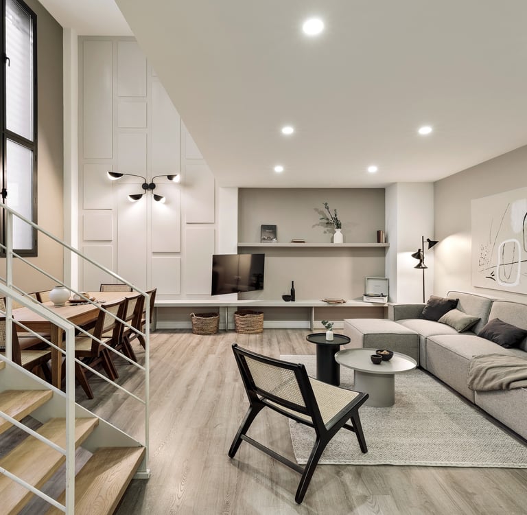 Falco is a bright 2-bedroom apartment in Barcelona, where muted simplicity meets elegance. Designed with subtle yet playful ideas, the apartment seamlessly blends modern and coastal vibes. The challenge for this project was to create a space that balances modern style with comfort, offering an environment that enhances daily living. We focused on making the most of natural light, while incorporating thoughtful design details to create a welcoming atmosphere. At its heart is a state-of-the-art open plan kitchen, featuring clean lines and minimalist aesthetics that flow into the living area, creating a spacious and functional environment. Bespoke relief wall panels in the living room add depth and texture, while maintaining an elegant, understated feel. The apartment’s private terrace enhances its livability, offering an intimate outdoor retreat that connects the indoor spaces with the surroundings.