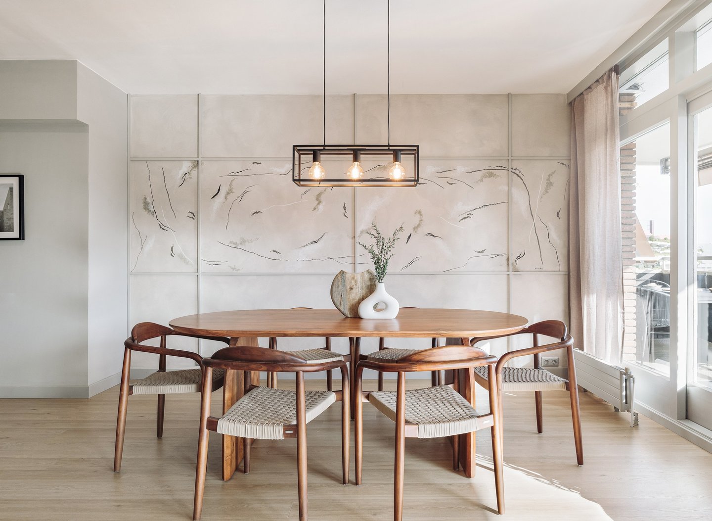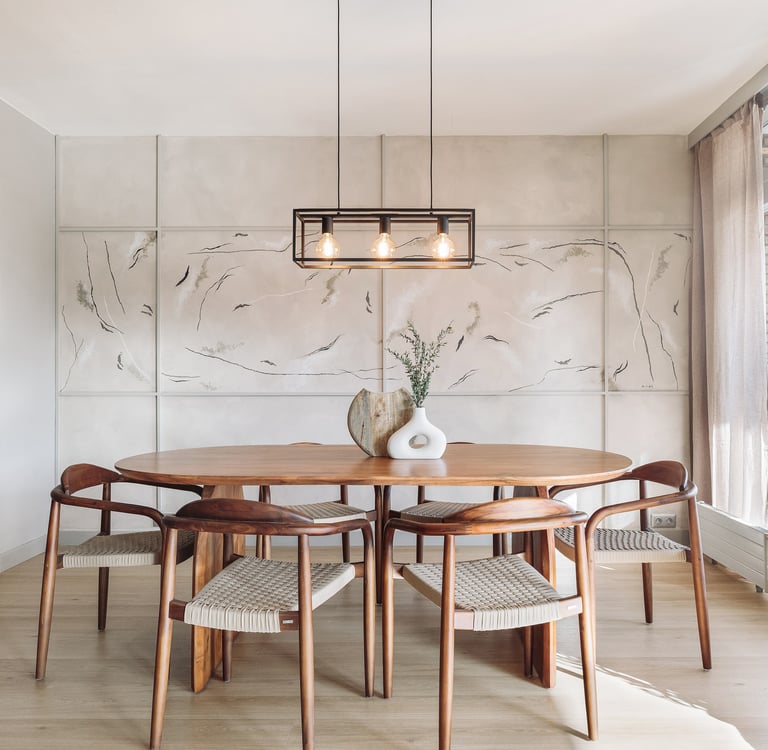 The living area is designed to be both practical and inviting, with a layout that fosters a harmonious flow. We chose to use subtle wood finishes for the furniture and detailing, ensuring a balance of warmth and elegance. Local art curated throughout the design adds personality, while warm tones juxtaposed with bold black accents exude contemporary sophistication. The dining area's geometric wall installation serves as a striking focal point, elevating the space's contemporary allure.