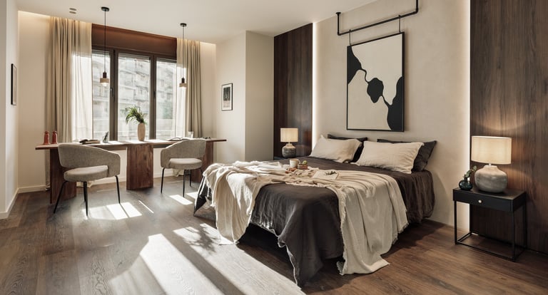Natural wood finishes in the furniture and decor enhance the space’s warmth, while the neutral color palette keeps the design serene and sfot. The apartment’s layout maximizes functionality, with distinct zones for living, dining, and working, ensuring a comfortable and efficient flow. The well-considered lighting adds versatility, allowing the space to adapt to various moods and settings. In the bedrooms, the interior design follows the same natural and relaxed vibe.